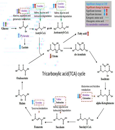 Altered metabolic pathways for discriminating T2DM were explored by enrichment analysis for metabolites with a significant change in CSF and plasma of T2DM patients, and the results are shown in Figure S3. Among the altered pathways, methyl-histidine metabolism showed significant fold changes both in CSF and plasma samples, and pathway analysis showed that most altered pathways had a connection with the tricarboxylic acid (TCA) cycle. Figure 5 illustrates the metabolic alterations of metabolites in the six-metabolite combination based on glycolysis and the TCA cycle and highlights the proposed connections between metabolites with significant change. After separation of significant metabolites into glucogenic amino acids or ketogenic amino acids, significant increase or decrease of metabolite levels in CSF and plasma samples of T2DM patients were highlighted. Most metabolites showed a similar direction of change in CSF and plasma samples; however, alanine levels showed a significant increase in CSF but a decrease in plasma.