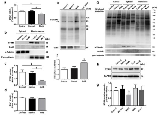 Effects of metabolic syndrome (MetS)-very low-density lipoproteins (VLDLs) on the expression of stromal interaction molecule 1 (STIM1) and calcium release-activated calcium channel protein 1 (Orai1) and the O-GlcNAcylation of STIM1. (a) Quantitative RT-PCR of STIM1 (n = 4 for each group). Reduced STIM1 mRNA in the MetS-VLDL-treated group (MetS) ($ P = 0.012, # P = 0.005). (b) Representative bands of western blots for STIM1 and Orai1 channel proteins. (c) Reduced STIM1 membrane protein expression in the MetS-VLDL group (n = 4 for each group; $ P = 0.025, # P = 0.021). (d) Orai1 channel membrane protein expression among groups (n = 4 for each group; P = 0.5223). (e,f) Representative immunoblots and densitometry analysis (n = 4 for each group). Although STIM1 protein expression was reduced, the O-GlcNAcylation (85 kDa, indicated by the arrow) was larger in the MetS group. $ P = 0.038 for the MetS group versus the control. All of the changes in the MetS group were absent in the normal-VLDL group (Normal). (g) Whole-cell O-GlcNAcylation immunoblotting showed enhanced O-GlcNAcylation of the nuclear, cytosol, and membranous protein fractions in the MetS groups. (g,h) The inhibition (with 5 μM deoxynorleucine (DON)) and enhancement (with 10 nM Thiamet G (ThmG)) of O-GlcNAcylation did not affect the expression of STIM1.