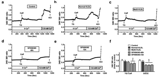To determine if SOCE can be suppressed by MetS-VLDLs along with the modulation of STIM1, the Ca2+ response was assessed in fluorescent Ca2+-labeled HL-1 cells (Figure 2). First, the SR store was assessed by the response of HL-1 upon administration of TG and caffeine to deplete the Ca2+ store in the SR. This response was demonstrated as an up-and-down wave using ratiometric tracing (Figure 2a–e). The peak of the TG/caffeine response was smaller in the MetS-VLDL group compared to the controls (Figure 2f). After the SR Ca2+ store was depleted, cells were perfused with 1.8 mM of Ca2+ solution. The SOCE was demonstrated as another up-and-down wave in ratiometric tracing. The peak was measured, and the average of 8–11 cells was obtained for each dish (experiment). The data analysis from five experiments for each group is shown in Figure 2f. The SOCE was significantly suppressed in the MetS-VLDL group (0.59 ± 0.03-fold versus control, P < 0.001). The SOCE remained unchanged in the normal-VLDL group under the same incubation conditions (0.86 ± 0.10-fold versus control, P = 0.093). A positive control experiment was performed through pre-incubation with the STIM1 inhibitor SKF 96365, which suppressed the SOCE. There was also a reduction in TG/caffeine-induced Ca2+ release, which presumably was a reduced SR Ca2+ store caused by the long-term (48 and 72 h) incubation with SKF 96365 (Figure 2d,e). In Figure 2f, SKF 96365 reduced the SR load without a complete depletion, suggesting a constitutive Ca2+ entry through a residual STIM1/Orai1 channel or others. The calcium release-activated channels (CRAC) channel inhibitor, which blocks STIM1–Orai1 coupling and induces more SOCE inhibition, was not applied in this study. The blockers for the voltage-dependent Ca2+ channel and Na/Ca exchanger have been shown to not affect the peak of SOCE in HL-1 cells [21]. These blockers were not applied in this study.