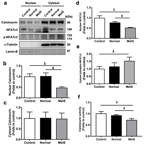 MetS-VLDLs suppressed calcineurin–nuclear factor of activated T-cells (NFAT) signaling pathways. (a) Representative bands of western blots (n = 4 for each group) for nuclear and cytosolic fractions of calcineurin, NFAT, and phosphorylated NFAT in proteins. (b) Reduced nuclear calcineurin in the MetS-VLDL group (MetS) (n = 4; $ P = 0.037 vs. control, # P = 0.04 vs. normal-VLDL group (Normal)). (c) Unchanged cytosolic expression of calcineurin protein (n = 4, P = 0.9377). (d) Reduced nuclear NFAT in the MetS group (n = 4; $ P = 0.007, # P = 0.009). (e) Increased phosphorylated NFAT in the cytoplasm of the MetS group (n = 4, $ P = 0.04). (f) Reduced calcineurin activity in the MetS group (n = 6; $ P = 0.0001, # P = 0.0001).