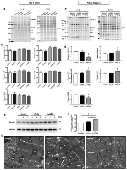 MetS-VLDLs altered myofilament protein expression and induced sarcomere derangement. (a) Phosphorylated cardiac myosin-binding protein C (cMyBPC), cardiac troponin I (TnI) and T (TnT), and myosin light chain 2 (MLC2) on 1D-gradient gels stained with ProQ Diamond reagent (left) and total protein expression shown on the gel subsequently stained with SYPRO Ruby (right). SKF 96365, a STIM1-inhibtor; FK-506, a calcineurin-inhibitor; n = 4 for each group. (b). Densitometry analyses from gels with ProQ and SYPRO staining. (c) ProQ Diamond staining gels of mouse atrial proteins (n = 3 for each group: Control; Normal-VLDL-injected mice, nVLDL; and MetS-VLDL-injected mice, msVLDL). (d) Densitometry analyses for phosphorylated cMyBPC, desmin, TnT, TnI, and MLC2. $ P < 0.05 msVLDL versus control; # P < 0.05 msVLDL versus nVLDL. (e,f) Western blot and densitometry analysis for desmin in atrial tissues. (g) Representative transmission electron microscopy (TEM) pictures (at 5000× magnification) showing disorganized Z lines (Z, highlighted with dashed lines) in the atrial tissue of mice receiving a MetS-VLDL injection (msVLDL) compared to normal Z lines in the controls and in mice receiving normal-VLDLs (nVLDL) (n = 3 for each group). Atrial sarcomeres are aligned with mitochondria (m).