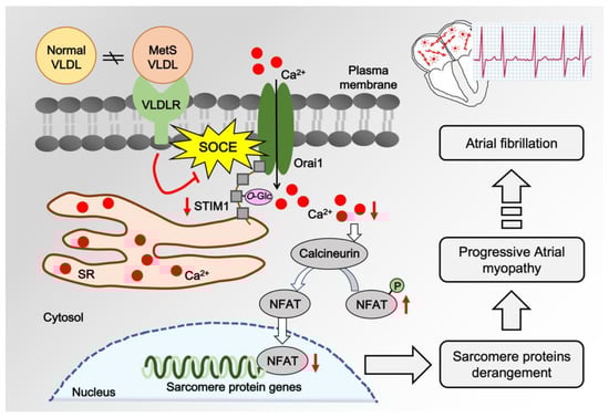 MetS-VLDLs reduced STIM1 expression at the transcriptional and translational levels. MetS-VLDLs also modified STIM1 via enhanced O-GlcNAcylation. This STIM1 modulation suppressed SOCE and inhibited the Ca2+–calcineurin–NFAT pathway, resulting in the alteration of sarcomere protein expression in atrial myocytes. These findings may partially explain the pathogenesis of atrial myopathy in MetS. For controlling atrial myopathy in its progression to prevent atrial fibrillation, we suggest a therapeutic target on VLDLs, especially for individuals with MetS.