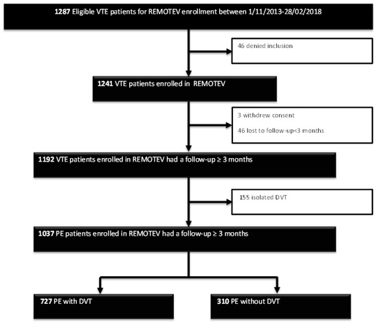 Study flowchart. DVT: deep vein thrombosis; PE: pulmonary embolism; VTE: venous thromboembolism. PE: pulmonary embolism; REMOTEV: Observational Prospective Monocentric Registry of Patients Suffering From Venous Thromboembolism.