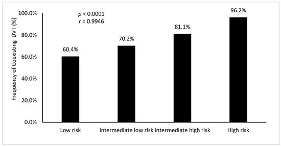 Presence of coexisting deep vein thrombosis (%) according to pulmonary embolism severity. DVT: deep vein thrombosis. r: Pearson’s correlation coefficient.