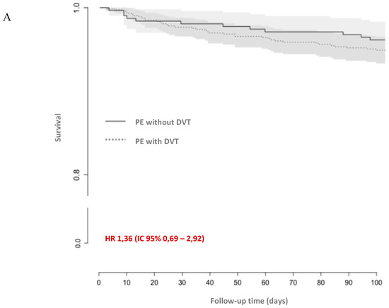 To date, published studies have design and methodology discrepancies showing conflicting results. Certain authors have identified a close relationship between coexisting DVT and PE prognosis (all-cause mortality and/or PE-related complications) [2,10,25]. Indeed, ICOPER (International Cooperative Pulmonary Embolism Registry) included 2442 patients with PE diagnosed on necropsy, lung scan, or pulmonary angiography and showed that DVT presence was inversely correlated to mortality risk (HR 0.5 (CI 95% 0.4–0.6)) [2]. Conversely, Jimenez et al. used a subgroup of the RIETE (The Computerized Registry of Patients with Venous Thromboembolism) population including 4476 patients for a validation cohort showing a 1.7-fold risk for all-cause death in patients with concomitant DVT, but their analysis had a retrospective design. In a meta-analysis of 10 cohorts (8859 patients), Becattini et al. found that the presence of a coexisting DVT was associated with higher PE severity and a 90% increase in the risk of 30-day all-cause mortality. However, 90-day PE-related adverse outcomes (VTE recurrence, PE-related death) were not significantly enhanced. Nonetheless, this meta-analysis included 10 cohorts of different methodology out of which only 2 studies totalizing 1003 patients had a prospective follow-up of at least 3 months [13,25].