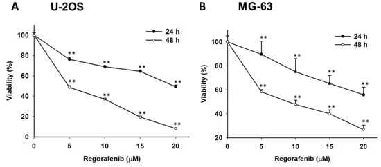 U-2 OS and MG-63 cells were plated at a density of 3 × 104 cells in a 96-well plate for 24 h and after the 80% confluence was reached, cells were treated with regorafenib at the final concentrations (0, 5, 10, 15, 20 µM) or 0.1% DMSO was used as a vehicle for 24 and 48 h. Cells were stained with MTT (0.5 mg/mL) and then the percentages of viability were readily quantified by absorbance value (OD) at 570 nm. The MTT agent was also purchased from Sigma Chemical Co. [].