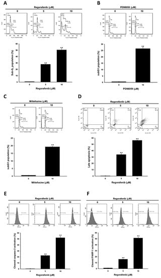 U-2 OS cells (seeded in a 6-well-plate with 5 × 105 cells/well overnight) were treated with 0, 5, 10 µM of regorafenib, 10 µM PD98059, or 10 µM miltefosine for 48 h, respectively. Cells were harvested by trypsinization, centrifugation, fixed in 70% ethanol at 4 °C and then resuspended in propidium iodide staining solution containing 40 µg/mL propidium iodide and 100 µg/mL RNase in PBS at 37 °C for 15 min before analysis by a flow cytometry. Flow cytometric analysis was performed with a flow cytometer (BD Biosciences, FACS Calibur, San Jose, CA, USA) with an excitation at 488 nm and an emission at 630 nm. Five repeated samples were all analyzed by FlowJo software (version 7.6.1; FlowJo LLC, Ashland, OR, USA) [].
