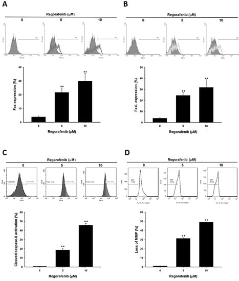 The death receptor dependent and mitochondria dependent apoptosis were activated by regorafenib. U-2 OS cells was treated with 0, 5, 10 µM of regorafenib for 48 h. The activation of (A) FAS, (B) FASL, and (C) cleaved caspase-8 were all detected by flow cytometry. (D) Mitochondria membrane potential was stained by DiOC6 and also assayed by flow cytometry. ** p < 0.01 vs. 0 µM of regorafenib.