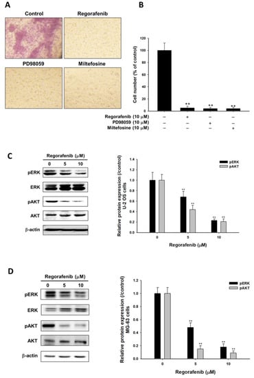 Transwell (BD Biosciences, Franklin Lakes, NJ, USA) cell culture chambers (8 mm pore size; illipore, Billerica, MA, USA) were uniformly coated with 50 µL BD matrigel matrix on polyethylene terephthalate (PET) membrane and used for cell invasion assay. U-2 OS cells (seeded with 8 × 105 cells/6 cm dish overnight) were treated with 0.1% DMSO (control), 10 µM regorafenib, 10 µM PD98059, or 10 µM miltefosine for 48 h. Cells were then trypsinized, resuspended in a serum-free medium, placed in the upper chamber of the transwell insert and the lower chamber was filled with complete medium (90% McCoy’s 5a medium containing 10% FBS). Cells were allowed to invade at 37 °C for 48 h. The nonmigrated cells were removed and the invaded cells in the PET membrane were fixed with 4% formaldehyde in PBS and were then stained with 0.5% crystal violet. The bottoms of the PET membranes were photographed and quantified under a light microscope at ×100 in five random fields per membrane [,].