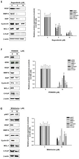 U-2 OS and MG-63 cells (plated with 1 × 106 cells/10 cm dish overnight) were treated with 0, 5, 10 µM of regorafenib, 10 µM PD98059, or 10 µM miltefosine for 48 h, respectively. Mice were sacrificed on day 15 after treatment and then tumors were isolated from mice. U-2 OS cells or U-2 OS tumor tissue were lysed by RIPA lysis buffer (Abcam, Cambridge, UK). The experimental procedure of Western blot was followed as described previously [,]. In brief, 40–80 µg total proteins were separated by polyacrylamide gel electrophoresis, transferred onto polyvinylidene difluoride (PVDF) membranes (EMD Millipore, Bedford, MA, USA) and were incubated with primary antibodies. The primary antibodies used were: Phospho-p44/42 MAPK (Erk1/2) (P27361, 1:1000, rabbit, Cell signaling, Danvers, MA, USA), tERK (sc-154, 1:1000, rabbit, Santa Cruz, CA, USA), VEGF (ab1316, 1:1000, mouse, Abcam), Phospho-Akt (Ser473) (P31749, 1:1000, rabbit, Cell signaling), Akt1/2/3 (sc-8312, 1:1000, rabbit, Santa Cruz), MMP-9 (AB19016, 1:1000, rabbit, EMD Millipore), XIAP (PA5-29253, 1:1000, rabbit, Thermo Fisher Scientific), CyclinD1 (DCS-6, 1:1000, mouse, Thermo Fisher Scientific), MCL-1 (BV-438, 1:1000, rabbit, BioVision), C-FLIP (D16A8, 1:1000, rabbit, Cell signaling), and β-actin (sc-47778, 1:1000, mouse, Santa Cruz). Membranes were stained with the appropriate secondary antibodies (GeneTex, Irvine, CA, USA) and were visualized with enhanced chemiluminescence detection (Millipore, Temecula, CA, USA). Image J 1.490 software (National Institutes of Health, Bethesda, MD, USA) was used to quantify changes in protein expression by densitometry analysis and using β-actin as the loading control.