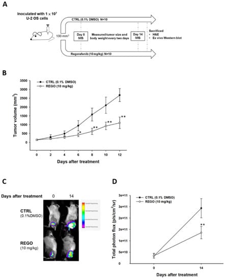The experimental procedure was described in Figure section. Mouse experiments were conducted under ethics approval from China Medical University Animal Ethics Committee (Permit Number: CMU IACUC-2019-018). Six week old male NOD/SCID mice were purchased from the National Laboratory Animal Center (Taipei, Taiwan). First, 1 × 107 U-2 OS/luc2 cells (200 µL of 1: 1 mixed cell suspension and matrigel) were subcutaneously injected into the left flanks of mice to establish a U-2 OS xenograft animal model []. A total of 20 mice were randomly divided into 2 groups after tumors reached 100 mm3, including non-treated control (CTRL, 0.1% DMSO) and regorafenib (10 mg/kg/day by gavage for 14 days). Tumor volumes were measured using a digital caliper, recorded and expressed in mm3, using the formula, volume (mm3) = (0.523) × length (mm) × width (mm) × height (mm). Mice were sacrificed on day 15 for further experiment.
