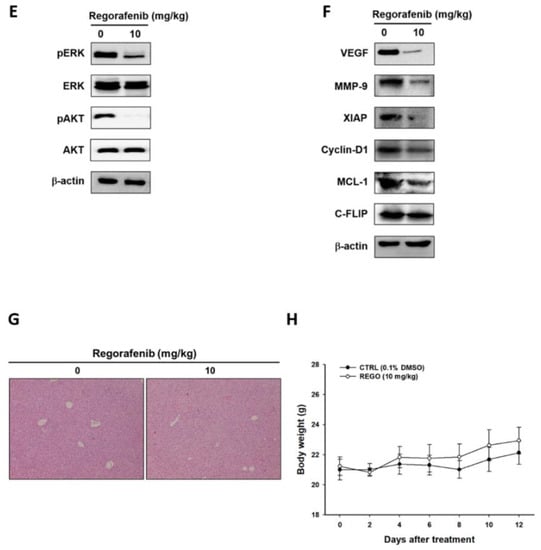 - Weng, M.C.; Wang, M.H.; Tsai, J.J.; Kuo, Y.C.; Liu, Y.C.; Hsu, F.T.; Wang, H.E. Regorafenib inhibits tumor progression through suppression of ERK/NF-kappaB activation in hepatocellular carcinoma bearing mice. Biosci Rep. 2018, 38, BSR20171264. [Google Scholar] [CrossRef]