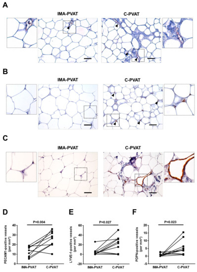 We had previously shown that C-PVAT from patients with CAD is characterized by more pronounced angiogenesis and higher numbers of blood vessels compared to IMA-PVAT [20]. Immunohistochemical detection of PECAM-1 in paired PVAT tissue specimens from 10 patients with CAD confirmed those previous findings by showing a significantly higher density of PECAM-1-immunopositive vessels in C-PVAT compared to IMA-PVAT (25.4 ± 2.75 vs. 12.9 ± 1.79 per mm2, p = 0.004; Figure 1A,D; for findings in negative controls please see Figure S1A). To distinguish lymphatic vessels, we used markers expressed on lymphatic endothelium, namely LYVE-1 and PDPN. LYVE-1 has been shown to be mainly expressed in lymphatic capillaries, PDPN in lymphatic collector vessels [23]. These analyses revealed that both the number of LYVE-1 (24.7 (0.61–32.3) vs. 2.97 (0–6.58) per mm2, p = 0.027; Figure 1B,E; Figure S1B) and PDPN (5.45 ± 1.54 vs. 0.74 ± 0.34 per mm2, p = 0.023; Figure 1C,F; Figure S1C) -immunopositive vessels was significantly increased in C-PVAT compared to IMA-PVAT. Of note, neither the anti-LYVE-1 nor the anti-PDPN antibody showed any immunoreactivity for endothelium lining blood vessels. Interestingly, the mean diameter of PDPN-positive vessels was significantly increased in C-PVAT compared to IMA-PVAT (p = 0.008), in line with lymphatic dysfunction [14,15].