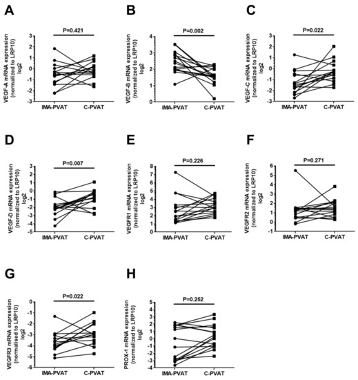 Analysis of growth factors involved in angiogenesis and lymphangiogenesis. Quantification of mRNA expression of vascular endothelial growth factor (VEGF)-A (A), VEGF-B (B), VEGF-C (C), VEGF-D (D), VEGF receptor (VEGFR)-1 (E), VEGFR2 (F), VEGFR3 (G), and prospero homeobox-1 (PROX-1) (H) in IMA-PVAT and C-PVAT of n = 15–16 patients with CAD. Paired IMA-PVAT (●) and C-PVAT (■) values in individual patients are connected with a line. Statistical analysis was performed using Wilcoxon matched-pairs signed rank test.