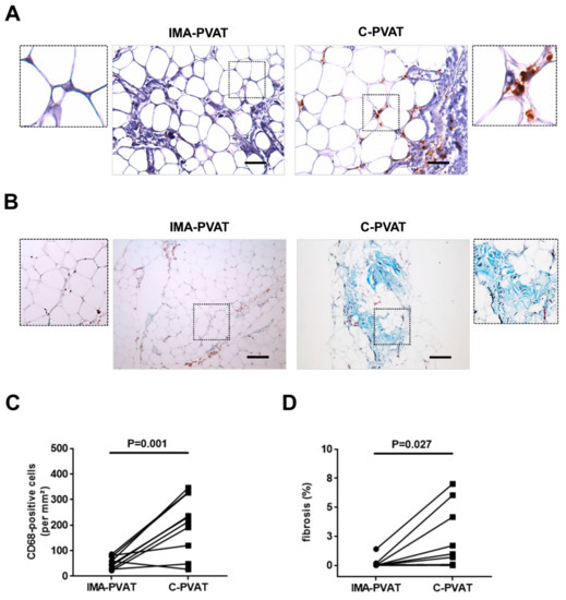 Fibrosis and inflammation in PVAT. (A) Immunohistochemical detection of CD68 in IMA-PVAT and C-PVAT. Size bars represent 50 μm. (B) Masson trichrome stain in IMA-PVAT and C-PVAT. Size bars represent 200 μm. (C) Quantification of the number of CD68-immunopositive cells per mm2. (D) Quantification of the percentage of fibrotic area in n = 10 patients with coronary artery disease (CAD). Paired IMA-PVAT (●) and C-PVAT (■) values in individual patients are connected with a line. Statistical analysis was performed using Student’s paired t-test (C) or Wilcoxon matched-pairs signed rank test (D).