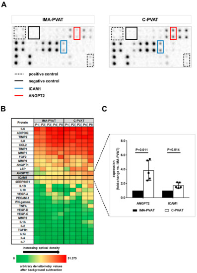 PVAT has been shown to express and secrete a number of cytokines and other factors, which may act locally or in a paracrine manner on the neighboring vessel wall (reviewed in [28]). For this reason and given our findings, we next aimed at investigating a broader spectrum of PVAT-secreted factors, with particular focus on potential candidates involved in (lymph)angiogenesis, inflammation and fibrosis. A semiquantitative paired expression analysis of 29 target proteins was performed in conditioned medium (CM) derived from C-PVAT and IMA-PVAT of five patients with CAD using a membrane-based antibody array (representative results are shown in Figure 4A, the position of all target proteins on the membranes is given in Figure S2). Among those, inflammatory factors (interleukin-6, interleukin-8, monocyte chemoattractant protein-1), matrix metalloproteinases (MMP1, MMP9) and their inhibitors (tissue inhibitor of metalloproteinases TIMP1, TIMP2), adipokines (adiponectin, leptin) and growth factors (angiopoietin-1 and -2, basic fibroblast growth factor) were detected in CM from both adipose tissue depots (heat map in Figure 4B, quantitative analyses for all 29 target proteins in Figure S3A–D).