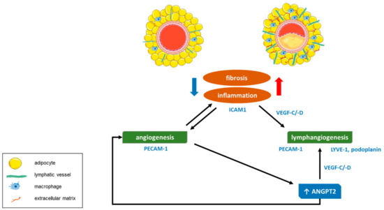 Overall, the findings of this and previous studies emphasize that the connections among (peri)vascular inflammation, fibrosis and (lymph)angiogenesis are rather complex and that the pathophysiological pathways underlying our observations are probably not unidirectional. Available data rather propose a circular mechanism with multiple shortcuts among various biological processes (schematically depicted in Figure 7), in which advanced atherosclerosis with arterial wall inflammation and fibrosis promote perivascular angiogenesis and lymphangiogenesis.