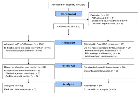 Of the 221 patients screened from March 2017 to January 2018, 21 patients were excluded from the study (Figure 1). 200 patients were randomized into two groups (pre-RSB (n = 100) and post-RSB (n = 100)). 6 patients in the pre-RSB group (paraumbilical port insertion) and 20 in the post-RSB group (paraumbilical port insertion, bile leakage, bleeding, and additional port insertion) did not receive allocated intervention. In addition, 12 patients in pre-RSB group who had bile leakage, bleeding, and additional port insertion during surgery were also excluded. Consequently, 162 patients were included in the final analysis. There were no significant differences in the baseline characteristics between the two groups (Table 1). There was no patient with insufficient RSB or ICNB when assessed by the pressure pain threshold using an algometer in the PACU.