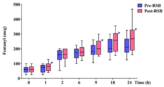 Total rescue analgesic consumption during 24 h after surgery (µg) was significantly lower in the pre-RSB group than in the post-RSB group (210.0 (175.0–265.0) vs. 267.5 (192.5–327.5), p = 0.020) (Figure 2). Within postoperative 24 h, the cumulated rescue analgesic consumption (µg) was significantly lower in the pre-RSB group than in the post-RSB group at 1, 9, and 18 h after surgery (75.0 (40.0–90.0) vs. 80.0 (50.0–100.0), p = 0.023; 182.5 (160.0–225.0) vs. 200.0 (160.0–252.5), p = 0.020; and 202.5 (175.0–265.0) vs. 257.5 (182.5–302.5), p = 0.002).