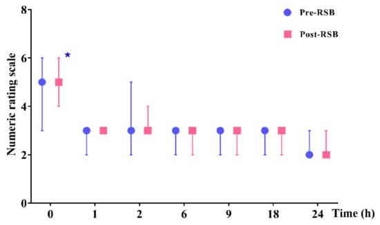 Postoperative pain scores (numerical rating scale 0 to 10) during 24 h after surgery. Data are expressed as median (interquartile range). * p < 0.05. Abbreviations: Pre-RSB, preoperative rectus sheath block; Post-RSB, postoperative rectus sheath block.