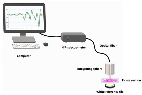 Spectral data were obtained at ambient temperature using a NIR spectrometer (AvaSpecNIR256-2.5-HSC, Avantes, Apeldoorn, The Netherlands), equipped with extended indium gallium arsenide (InGaAs) array technology. Tissue sections were placed onto a white reference tile, layered with immersion oil to eliminate loss of resolution due to different refractive surfaces (glass versus air). Subsequently, an immobilized 50 mm integrating sphere (AvaSphere-50-LS-HAL-6-S1, Avantes) with a 6 mm sample port diameter was placed directly onto the tissue sections for analysis. Analysis was performed in the renal cortex zone, indicated by a pathologist. Figure 1 illustrates the basic components of the proposed method. Spectra of the reflected light were recorded across the range of 1038–2354 nm at a resolution of 13 nm (128 averaged scans). All samples were analyzed in batch to minimize external variabilities.