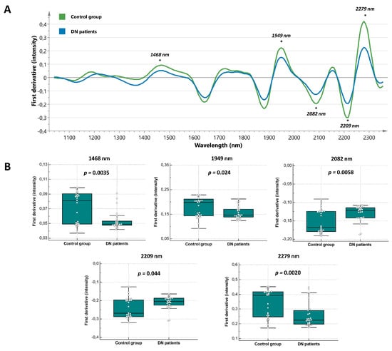 Discriminative spectral features in diabetic nephropathy (DN) patients. (A) First derivative of the median spectra from the control group (green line, n = 27) and DN patients (blue line, n = 26). Statistically significant differences (Mann-Whitney U test) in peak intensities between both groups are indicated with an asterisk. In first derivative, resolution is enhanced since the rate of change of absorbance (A) with respect to wavelength (λ) is examined (dA/dλ). (B) Box and whisker plots showing decreased intensities at 1468 nm, 1949 nm, and 2279 nm in the group of DN patients, compared to the controls. In contrast, the intensities at 2082 nm and 2209 nm showed significant increases.