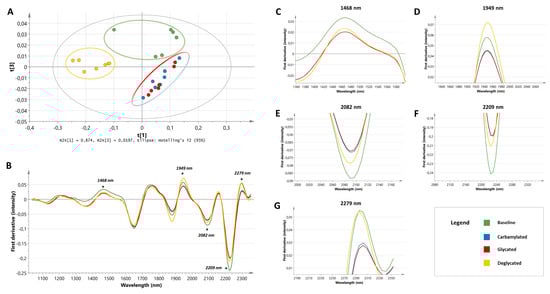 Spectral signature of (de)glycated and carbamoylated tissue sections. (A) Score plot showing clear clustering of three groups: baseline samples (green dots), deglycated samples (yellow dots), and a separate group with the glycated and carbamoylated samples (red and blue dots, respectively) based on the 1700–2165 nm spectral range. (B) First derivative of the mean spectra (full spectral range) from the baseline samples (green line), carbamoylated (blue line), glycated (red line), and deglycated samples (yellow line). Close-up on the zones of interest at 1468 nm (C), 1949 nm (D), 2082 nm (E), 2209 nm (F), and 2279 nm (G).