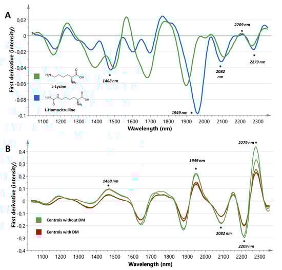 (A) First derivative spectra of lysine (green line) and homocitrulline powder (blue line). The peaks of interest are indicated with an asterisk. (B) First derivative spectra of non-post-transplant patients without DM (n = 2) and non-post-transplant patients with DM (n = 3).