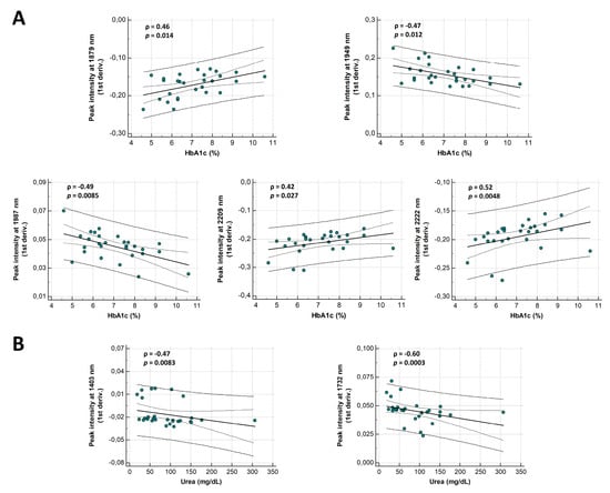 Correlation of spectral markers with routine laboratory parameters. (A) Scatterplots illustrating Spearman’s correlations between first derivative intensities at 1879 nm, 1949 nm, 2209 nm, 1987 nm, 2222 nm, and hemoglobin A1c (HbA1c) (%). (B) Scatterplots illustrating correlations between first derivative intensities at 1403 nm, 1732 nm, and urea (mg/dL). The solid and dashed lines represent the 95% prediction interval and 95% confidence interval, respectively.