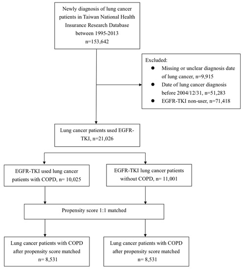We identified all lung cancer patients (ICD-9-CM: 162) using either hospitalization or outpatient diagnoses between 1995 and 2013. The date of lung cancer diagnosis, either by clinical imaging or pathologic confirmation, was set as the index date. To explore our hypothesis, we confined study cohort to lung cancer patients that underwent EGFR-TKI (gefitinib or erlotinib) and divided it into two subgroups based on the presence of COPD (ICD-9-CM: 491, 492, 496). We further performed propensity score matching to balance the intergroup difference of covariates.