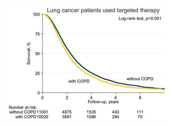 The emergence of epidermal growth factor receptor-tyrosine kinase inhibitor (EGFR-TKI) caused a paradigm shift in the treatment of non-small cell lung cancer (NSCLC). Although several clinicopathologic factors to predict the response to and survival on EGFR-TKI were recognized, its efficacy has not been confirmed for patients with underlying pulmonary disease, such as chronic obstructive pulmonary disease (COPD). We conducted the study to evaluate the impact of COPD on survival for NSCLC patients that underwent EGFR-TKI treatment. The nationwide study obtained clinicopathologic data from the National Health Insurance Research Database in Taiwan between 1995 and 2013. Patients receiving EGRR-TKI were divided into COPD and non-COPD groups, and adjusted for age, sex, comorbidities, premium level and cancer treatments. Overall survival (OS) and progression-free survival (PFS) were calculated by Kaplan–Meier analysis. In total, 21,026 NSCLC patients were enrolled, of which 47.6% had COPD. After propensity score (PS) matching, all covariates were adjusted and balanced except for age (p < 0.001). In the survival analysis, the median OS (2.04 vs. 2.28 years, p < 0.001) and PFS (0.62 vs. 0.69 years, p < 0.001) of lung cancer with COPD were significantly worse than those without COPD. Lung cancer patients on EGFR-TKI treatment had a worse survival outcome if patients had pre-existing COPD.