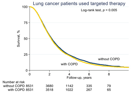 Our study had some limitations. First, and the most important, the retrospective cohort study lacked evidence of EGFR mutation, which might cause an imbalanced distribution between COPD and non-COPD groups. The bias could be minimized by the high prevalence of EGFR mutation in Taiwan and the administrative process for first-line EGFR-TKI treatment by the NHI. The prevalence of EGFR mutation in Taiwan was much higher (40.8% to 62.1%) than that in Western countries, indicating that more than half of all lung cancers in Taiwan should be effectively treated with EGFR-TKI [33,34,35]. In addition, application for first-line EGFR-TKI treatment required attachment of EGFR mutation reports for administrative review by the NHI policy. In our study, 35% of all enrolled patients underwent first-line EGFR-TKI treatment in both cohorts, indicating that at least one third of patients had documented EGFR mutation and were allocated equally. Second, although the severity of COPD could be identified, it was not correlated with other comorbidities and survival. Despite this, we adjusted all possible confounding factors and performed PS matching, but the difference of age between the two cohorts still could not be eliminated and could therefore be a confounder.