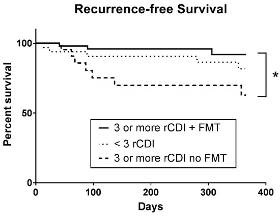 Recurrence-free survival in FMT and non-FMT groups. Recurrence-free survival analysis was performed using the Mantel–Cox log-rank test. The following three groups were compared: patients with three or more recurrent CDIs (rCDIs) who underwent FMT, patients with less than three rCDIs and therefore ineligible for FMTs, and patients with three or more rCDIs who deferred FMT due to other reasons.