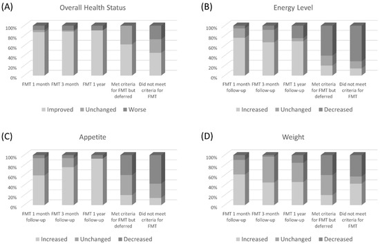 In addition to a subjective improvement in overall state of health, similar trends were observed with changes in energy level, appetite, and weight, where non-FMT patients reported more “decreased” rates in these parameters as compared with FMT patients (Figure 2B–D). Information about abdominal pain and bowel movements were also obtained but there were no significant differences noted between the treatment groups.