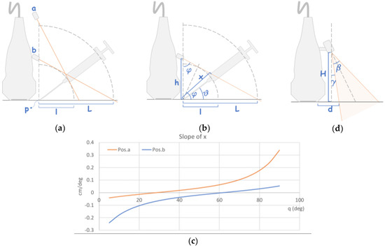 Geometric representation of the proposed positioning of the laser units. (a) Proposed setups of the pointing laser unit. (b) Geometric characteristics of the setup. (c) Profiles of slope of x against various needle angles. (d) Geometric layout of the lining laser unit.