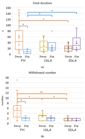 Significance of difference in the performance of the inexperienced and experienced subjects compared between various assistance conditions. * p < 0.05, ** p < 0.01.