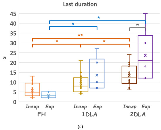 Comparisons of the performance of the subjects assisted by the three different modes. Data of (a) total duration, (b) withdrawal number, and (c) last duration of the inexperienced and experienced subjects performing in the freehand (FH), assisted with the lining laser (1DLA), and assisted with lining plus pointing laser (2DLA) condition. * p < 0.05, ** p < 0.01.