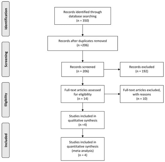 Two authors (C.K. and H.H.K.) completed an independent review of 350 articles. A total of 336 articles were excluded after examining titles and abstracts. Full texts of 14 articles were evaluated. In accordance with all previously mentioned inclusion criteria, four studies were finally enrolled in this systematic review and meta-analysis [7,9,10,11]. Any discrepancy between the two authors was resolved by discussion. PRISMA flow chart depicting the process for systematic literature search and selection of studies is shown in Figure 1.