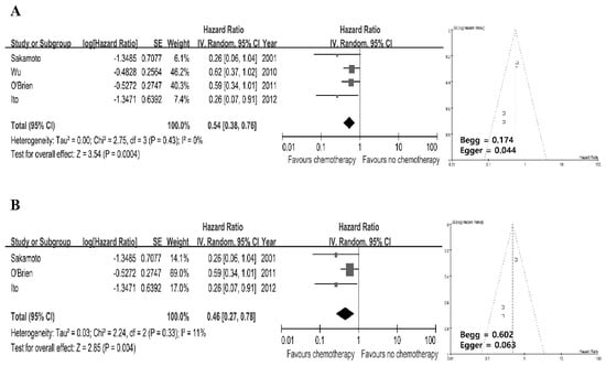 According to a priori assumption about the likelihood for heterogeneity between primary studies, pooled HR estimate of each study was calculated using the random effect model. Pooled analysis of intravesical recurrence-free survival indicated that intravesical chemotherapy after radical nephroureterectomy had better intravesical recurrence-free survival when compared to radical nephroureterectomy only (HR: 0.54; 95% CI: 0.38–0.76; p = 0.0004). There was no significant heterogeneity among these studies (p = 0.43; I2 = 0%) (Figure 4A). Three prospective controlled trials reported analysis results for comparison, showing that intravesical chemotherapy after radical nephroureterectomy was significantly associated with better intravesical recurrence-free survival (HR: 0.46; 95% CI: 0.27–0.78; p = 0.0004). Test of inconsistency excluded significant heterogeneity (p = 0.33; I2 = 11%) (Figure 4B). Funnel plots demonstrated no evidence of remarkable asymmetry. The Begg test indicated no significant (p > 0.05) publication bias among these studies. However, the use of the Egger test for these four studies demonstrated a significant (p = 0.044) publication bias.