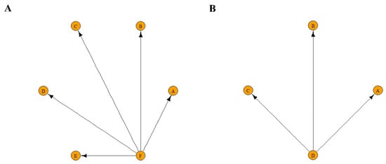 Network geometry of connected network of studies. Circles represent the regimen as a node in the network. Lines represent direct comparisons using studies. Each regimen was compared based on the effect of the control (no instillation). (A) All studies. A: Mitomycin C (MMC) 20 mg + Ara-C 200 mg (maintenance). B: MMC 10 mg (induction). C: Epirubicin 20 mg (induction). D: MMC 40 mg (single instillation). E: Pirarubicin 30 mg (single instillation). F: Control (no instillation). (B) Prospective controlled trials. A: MMC 20 mg + Ara-C 200 mg (maintenance). B: MMC 40 mg (single instillation). C: Pirarubicin 30 mg (single instillation). D: Control (no instillation).