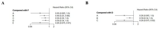 Hazard ratio and 95% credible intervals relative to control. HR < 1 means the regimen is better compared to the control. (A) All studies. A: MMC 20 mg + Ara-C 200 mg (maintenance). B: MMC 10 mg (induction). C: Epirubicin 20 mg (induction). D: MMC 40 mg (single instillation). E: Pirarubicin 30 mg (single instillation). F: Control. (B) Prospective controlled trials. A: MMC 20 mg + Ara-C 200 mg (maintenance). B: MMC 40 mg (single instillation). C: Pirarubicin 30 mg (single instillation). D: Control.