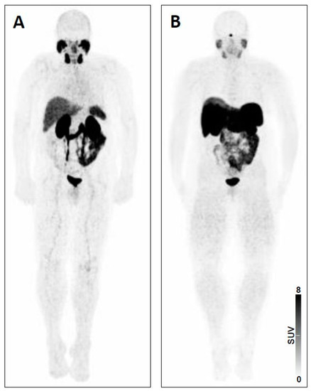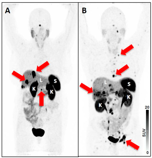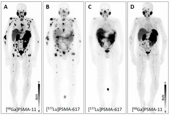 Recently, another theranostic approach using prostate-specific membrane antigen (PSMA)-targeted radiotracers for diagnostics and therapy of advanced prostate carcinoma (PC) has gained increased interest. This novel radiotracer addresses previously unmet clinical needs for PC including early detection, initial cancer staging and detection of local recurrence or metastases to guide appropriate therapy application, e.g., radioligand therapy (RLT) with its 177Lu-based counterpart [8]. Similar to PRRT for NET, recent reports have shown substantial benefit of PSMA-based RLT for end-stage PC patients with extensive tumor load, with a parallel decrease of tumor marker (prostate-specific antigen, PSA) levels [2]. Recently, 43 men suffering from metastatic castration-resistant PC were included in the single-arm, single-centre, prospective phase 2 LuPSMA trial. At time of study entry, all subjects had demonstrated progressive disease after first- and second-line treatments (including taxane-based chemotherapy and second-generation anti-androgens). After proving sufficient PSMA expression on the PC cells, individuals were scheduled for treatment with 177Lu-PSMA-617 and the majority of the subjects demonstrated an objective response rate of up to 82% in nodal or visceral disease. Notably, limited adverse effects were reported (Figure 1) [9].