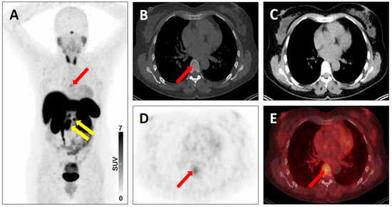 - Jochumsen, M.R.; Gormsen, L.C.; Nielsen, G.L. 68 Ga-PSMA avid primary adenocarcinoma of the lung with complementary low 18F-FDG uptake. Clin. Nucl. Med. 2018, 43, 117–119. [Google Scholar] [CrossRef] [PubMed]