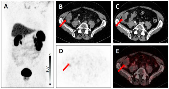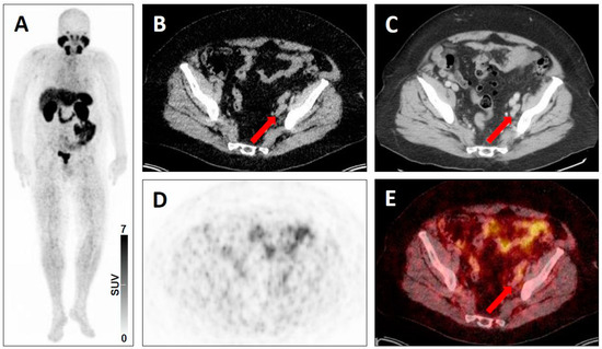 Equivocal uptake in soft-tissue lesion typical of prostate cancer lesion on PSMA-targeted positron emission tomography (PET)/computed tomography (CT). 68Ga-PSMA-11 PET/CT for restaging in a 73-year-old man with a history of a prostate cancer. Whole-body maximum intensity projection image showing absence of clearly pathologic radiotracer uptake (A). Axial low-dose CT (B), contrast-enhanced CT (C), PET (D), and fused PET/CT (E) showing an iliac lymph node typical of a prostate cancer lesion on anatomic imaging, but with equivocal uptake (red arrows), consistent with a PSMA-RADS-3A lesion.