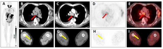 Equivocal uptake in soft-tissue and bone lesions on PSMA-targeted positron emission tomography (PET)/computed tomography (CT). 68Ga-PSMA-11 PET/CT for restaging in a 66-year-old man with a history of a prostate cancer. Whole-body maximum intensity projection image showing multiple metastases to lymph nodes and to the bone with both clearly pathologic radiotracer uptake and equivocal radiotracer uptake (A). Axial low-dose CT image (B), contrast-enhanced CT image (C), PET image (D), and fused PET/CT image (E) showing a mediastinal lymph node typical of a prostate cancer lesion on anatomic imaging, but with equivocal uptake (red arrows), consistent with a PSMA-RADS-3A lesion. Axial soft-tissue window CT image (F), bone-window CT image (G), PET image (H) and fused PET/CT image (I) showing a bone marrow lesion not atypical of a prostate cancer lesion on anatomic imaging, but with equivocal uptake (yellow arrows), consistent with a PSMA-RADS-3B lesion.