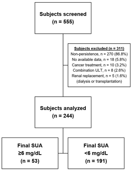 In this study, we identified individuals who were newly prescribed with urate-lowering agents, namely, allopurinol, febuxostat, or benzbromarone, after a working diagnosis of gout had been established by a board-certified rheumatologist in a single tertiary hospital between 1 March 2007, and 28 February 2017. Those who had not undergone prior treatment with urate-lowering agents and had at least 12 months of continuous ULT were included in the study. The exclusion criteria were: <20 years of age, pregnancy or lactation, a history of dialysis or renal transplantation, initial combination ULT, non-persistence (defined as the occurrence of the first gap in time covered by ULT prescription of at least 30 days after the end of the previous prescription), treatment for any malignant neoplasm during the study period, or no available clinical data.