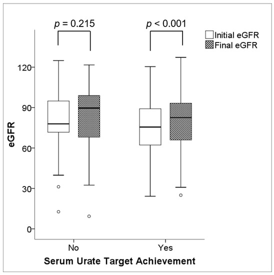 While there was no improvement in renal function in patients who failed to attain the target serum urate concentration (79.72 ± 21.80 mL/min/1.73 m2 vs. 82.40 ± 23.21 mL/min/1.73 m2, p = 0.215), patients who achieved the target serum urate concentration had an improvement in renal function (76.40 ± 18.81 mL/min/1.73 m2 vs. 80.30 ± 20.41 mL/min/1.73 m2, p < 0.001), as depicted in Figure 2. Clinical characteristics were generally comparable between the two groups, except for the mean age at baseline, which was higher in patients who attained the serum urate target (46.3 ± 14.8 years vs. 52.2 ± 13.9 years, p = 0.008) (Table 2).