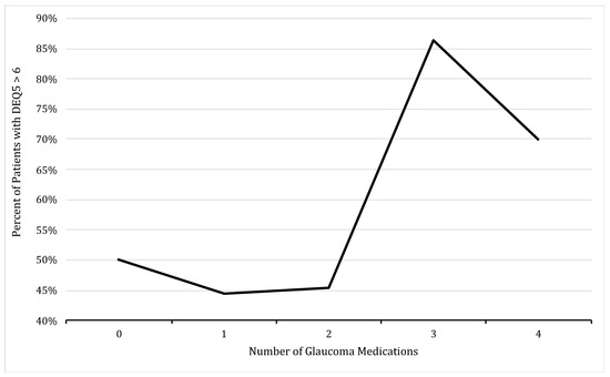 Percent of glaucoma patients, classified by number of medications used, with a five item Dry Eye Questionnaire (DEQ5) score of >6, indicating mild or greater dry eye symptoms.