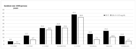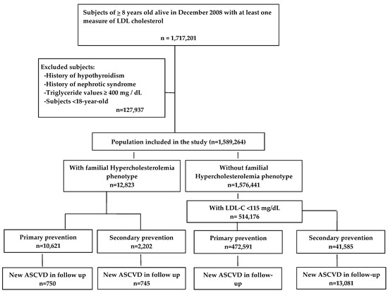 Among 1,589,264 patients that fulfilled selection criteria, 514,176 subjects had LDL-C ≤ 115 mg/dL and were selected as the reference normolipidemic group. The criteria for FH-P applied to 12,823 patients, 2202 of whom had previous ASCVD. Incident ASCVD occurred in 1495 patients with FH-P, 750 in primary prevention and 745 in secondary prevention; and in 28,061 patients from the normolipidemic group, 15,980 in primary prevention and 13,081 in secondary (Figure 1). Table 1 shows the baseline characteristics of the study population.
