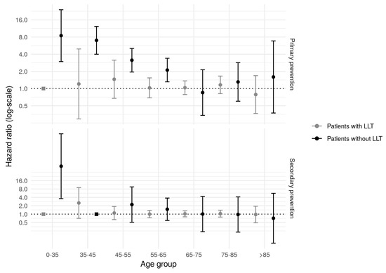 The HRs for CHD in secondary prevention were also visibly higher in younger than in older. i.e., HRs (95% CI) for CHD in the <35-year-old group was 5.98 (0.81–44.06). This excess of risk disappeared around 55 years (Table S5).